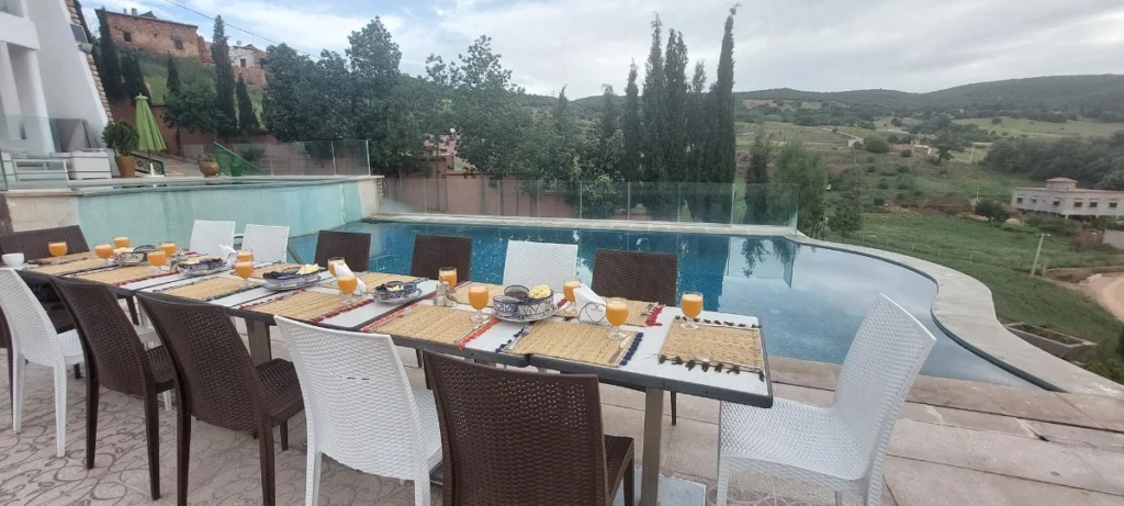 Aquí todo es muy básico, una pequeña mesa,  un suculento tajine bereber, té,  pan…. Y unas vistas de cuento.